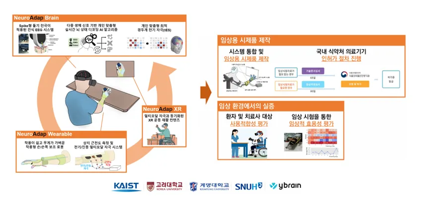 본 과제에서는 임상 환경에서 뇌졸중 환자의 신경가소성 기반 재활 효과를 극대화하기위해 뇌신경계 상태 측정 및 실시간 분석 기술, 착용이 쉬운 경량 착용형 손/손목 보조 로봇, XR 재활 컨텐츠 기반 멀티모달 감각 피드백 자극 및 뇌자극 기술을 융합한 적응형 AI 기반 개인화된 뇌-기계 폐루프 인터페이스 시스템을 개발하고자 한다.