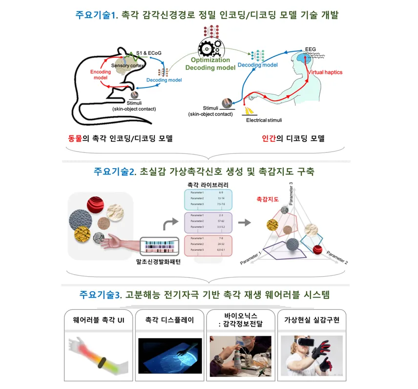 본 과제에서는 초실감 가상촉각신호 생성 및 재상 웨어러블 시스템 개발하고자 한다. 사람의 촉감을 느끼는 감각수용체부터 뇌에서의 정보처리 과정까지를 의미하는 감각신경경로를 규명하고 이를 기반으로 현실에 가까운 인공 촉감을 생성 및 재생하는 시스템을 개발하고자 한다.