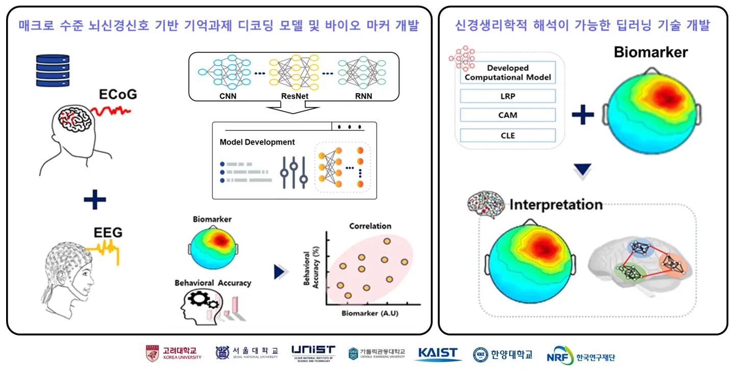 본 과제에서 고려대학교 지능형 신경공학 연구실은 인간 매크로 수준 뇌신경신호 기반 기억과제 수행 결과를 인코딩 단계에서 디코딩 할 수 있는 딥러닝 모델 개발 및 입력텐서 개발, 바이오마커 개발 등을 통해 디코딩 성능을 향상시키고, 딥러닝 모델과 바이오마커의 상관 관계 확인 및 연계 해석을 통해 뇌신경 신호를 이용하여 신경생리학적 해석이 가능한 딥러닝 기술을 개발하고자 한다.