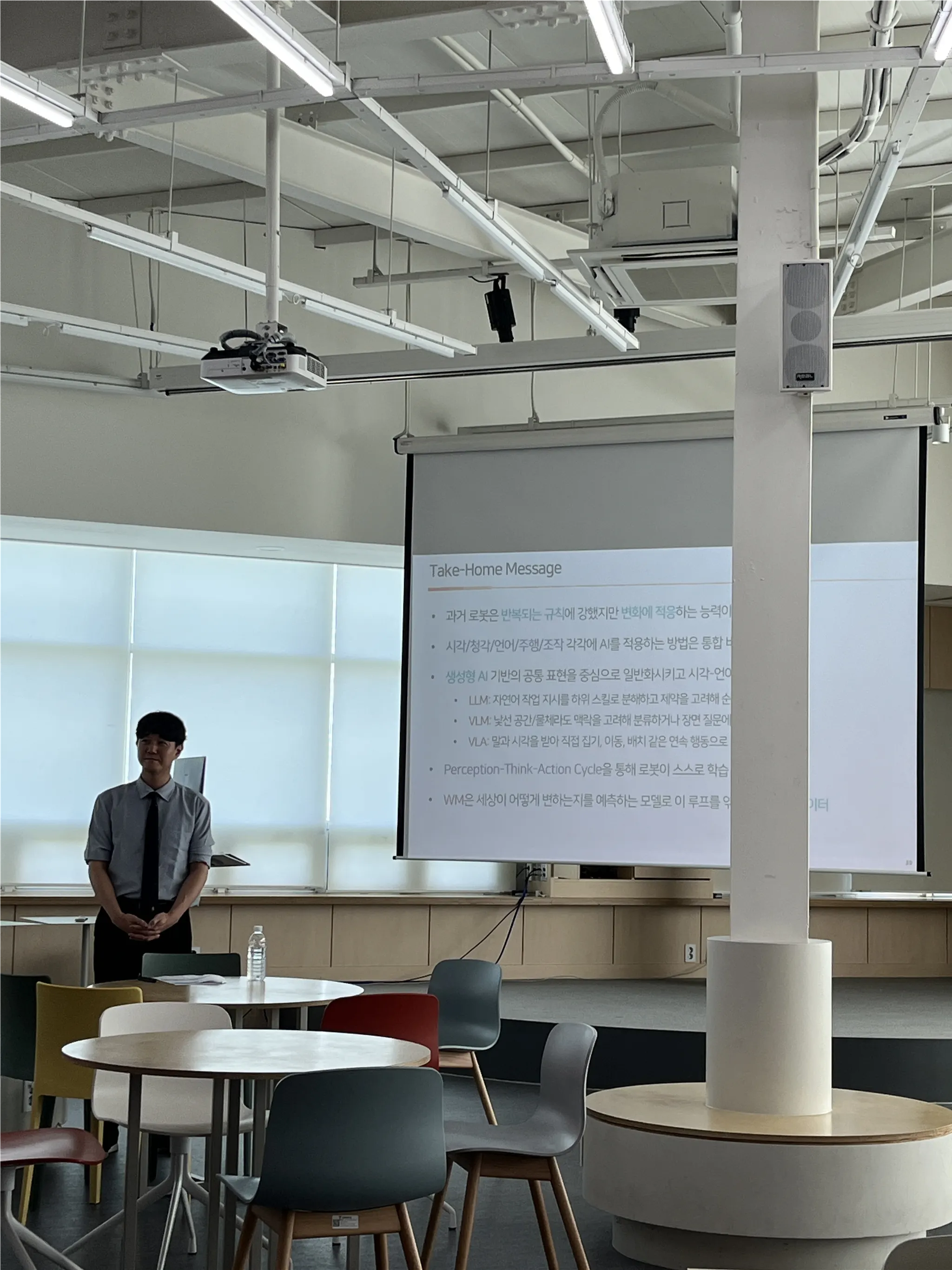 일시: 2025.10.01(수) 11:00 - 12:00 장소: 과학기술 1관 Co-working space 써로 마인드에서 오신 이충연 본부장님께서 “로봇, 인공지능을 품다”라는 내용으로 발표를 진행하셨습니다.