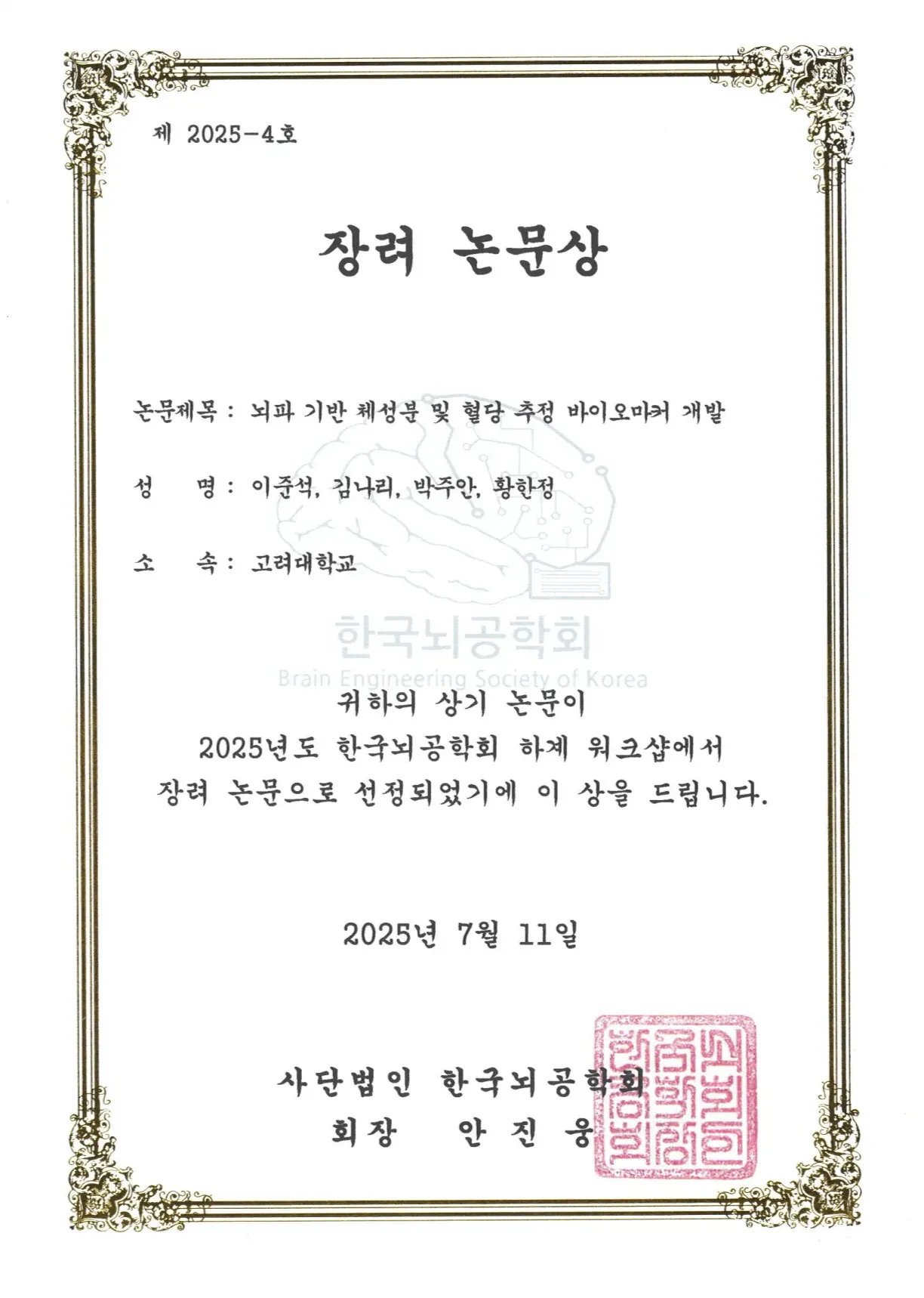 2025 한국뇌공학회 하계워크샵 장려논문상