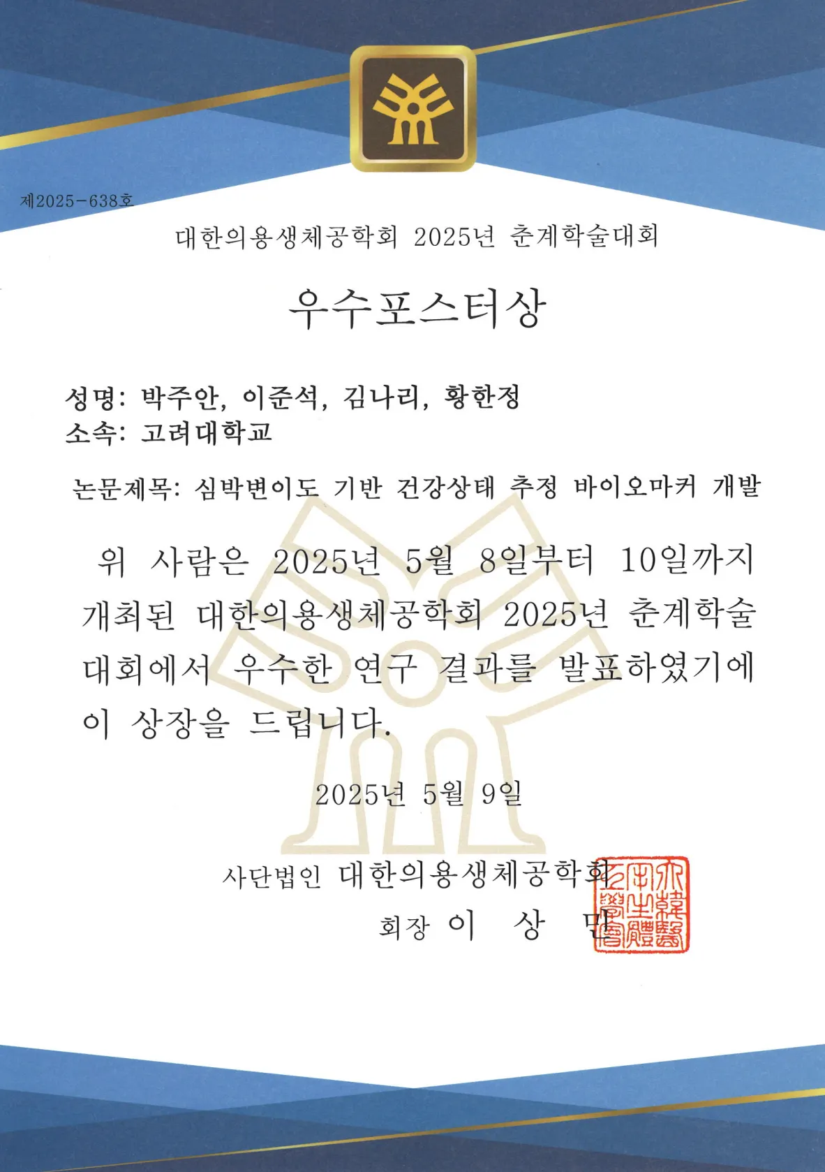 2025 대한의용생체공학회 춘계학술대회 우수포스터