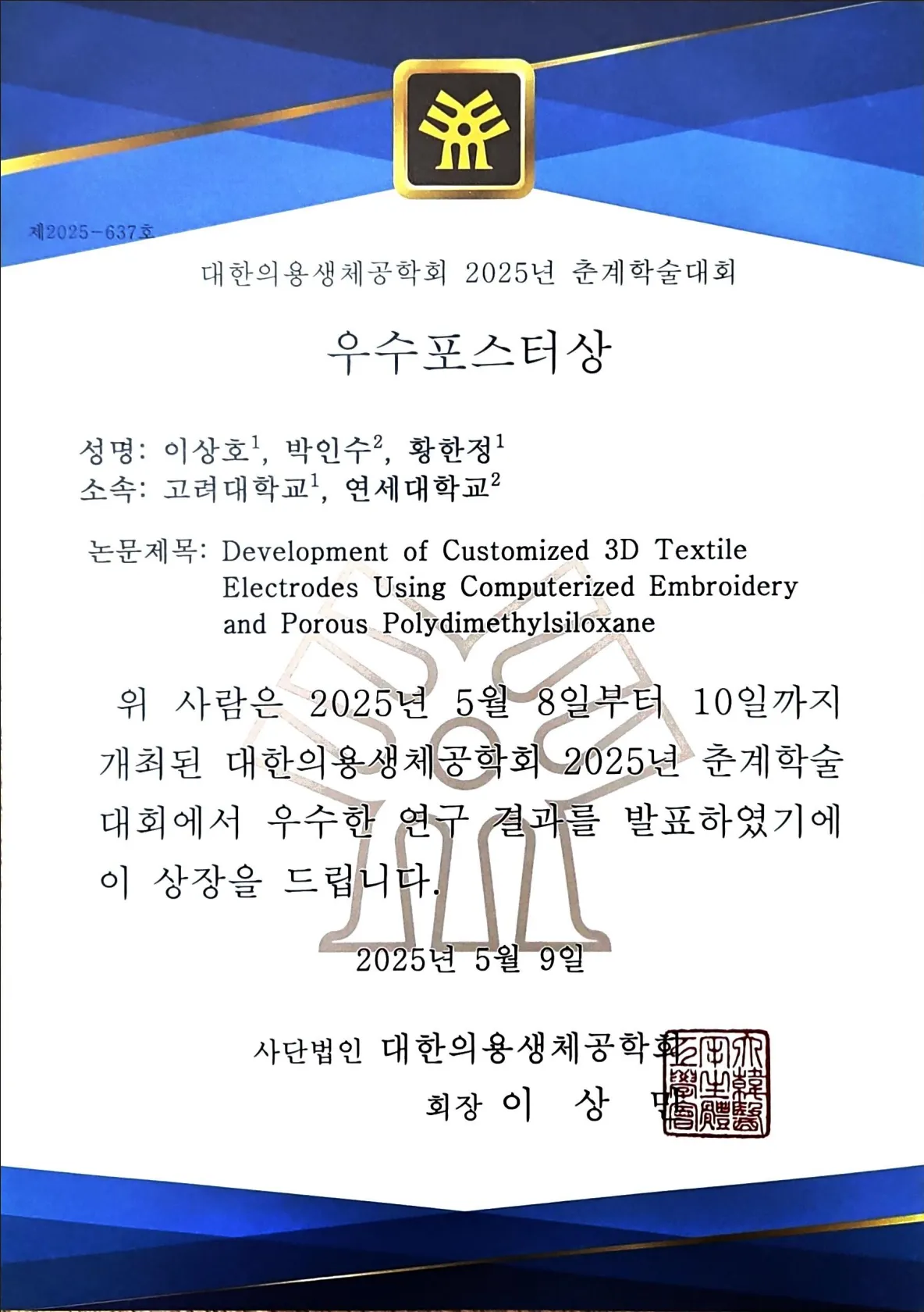 2025 대한의용생체공학회 춘계학술대회 우수포스터상