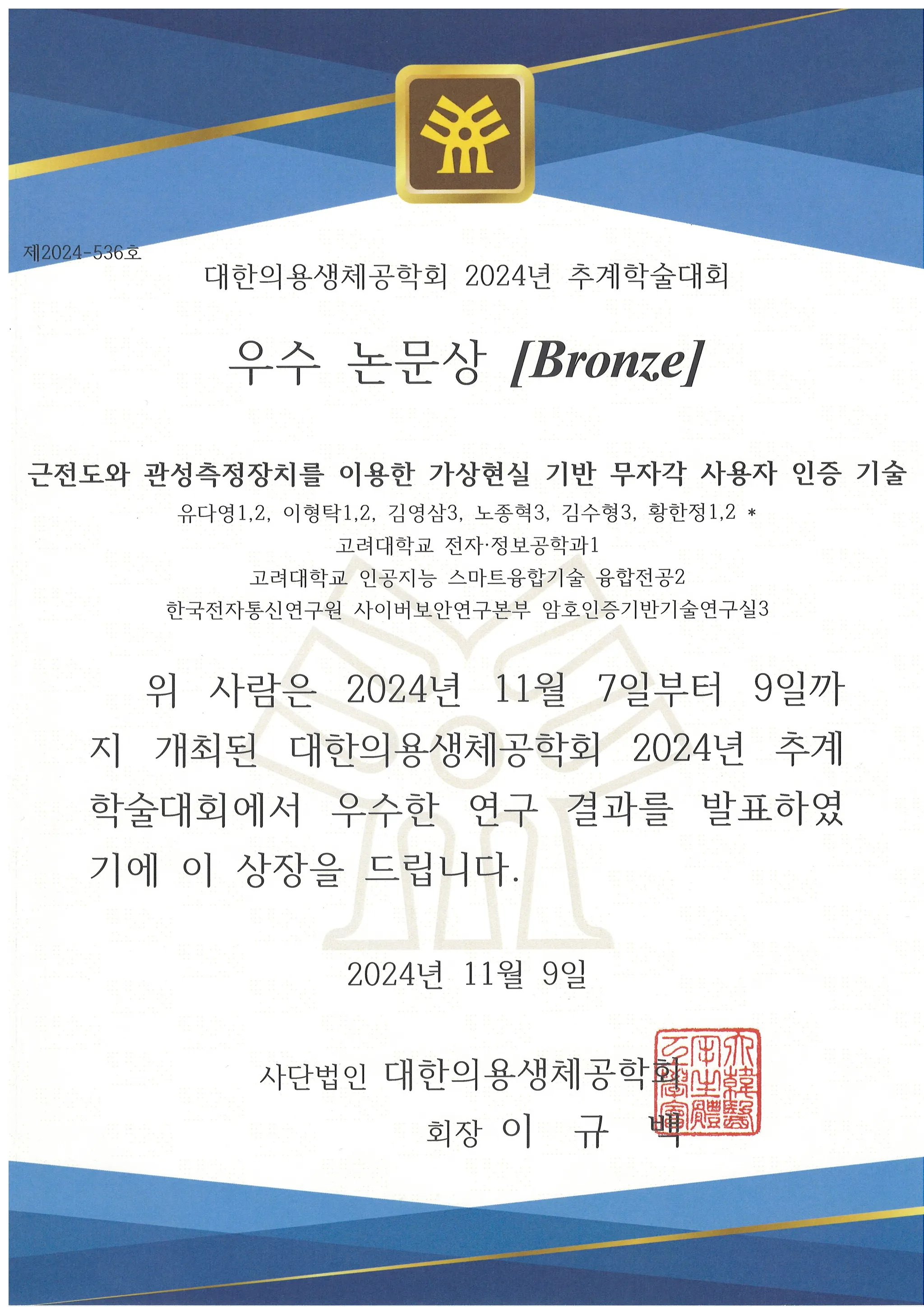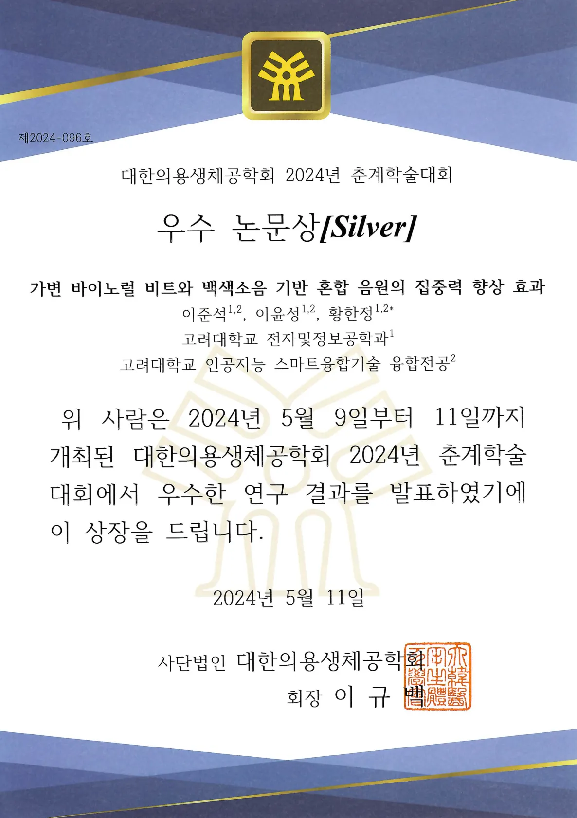 2024 대한의용생체공학회 춘계학술대회 우수논문상