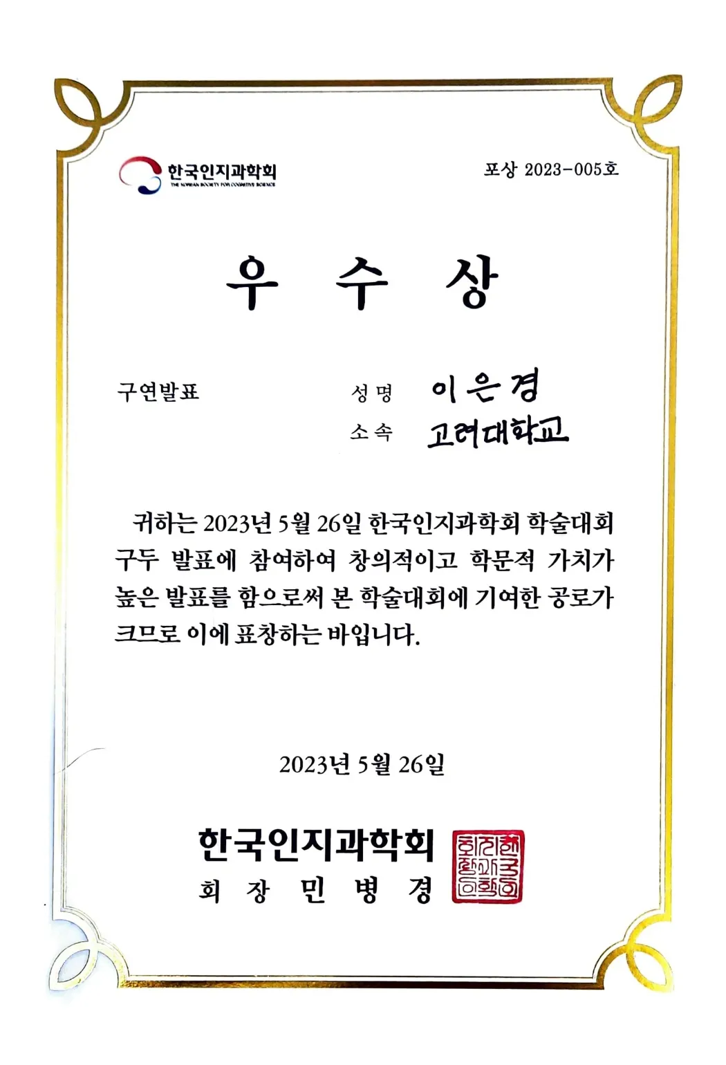 2023 한국인지과학회 학술대회 구연발표 우수상