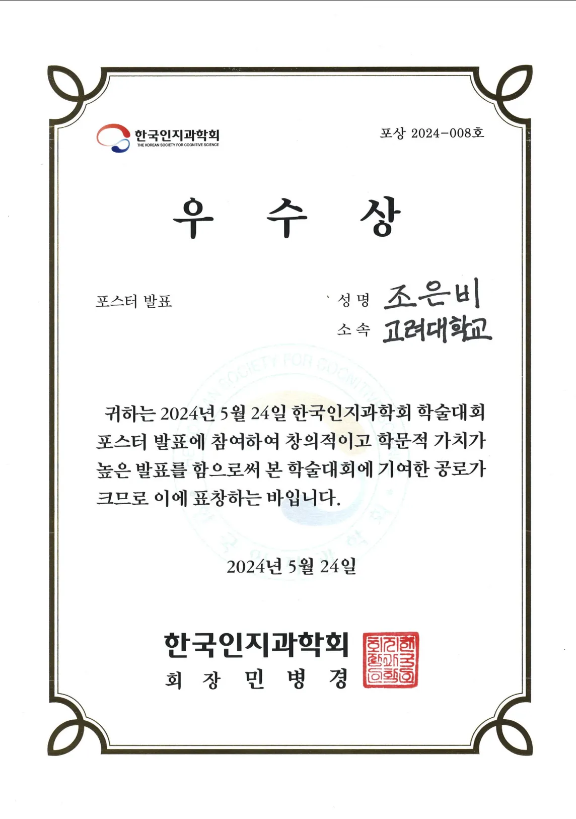 2024 한국인지과학회 학술대회 포스터 발표 우수상