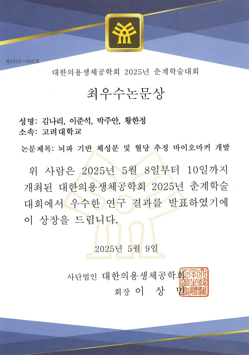 2025 대한의용생체공학회 춘계학술대회 최우수논문상