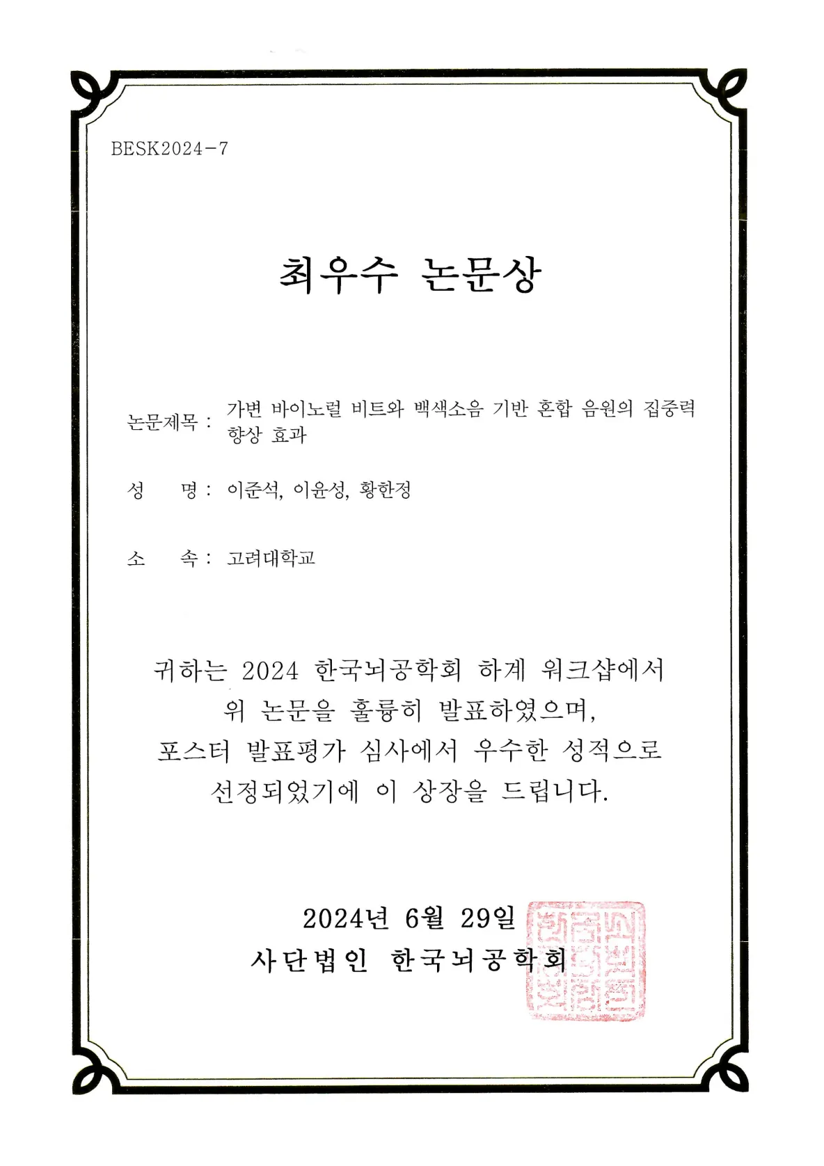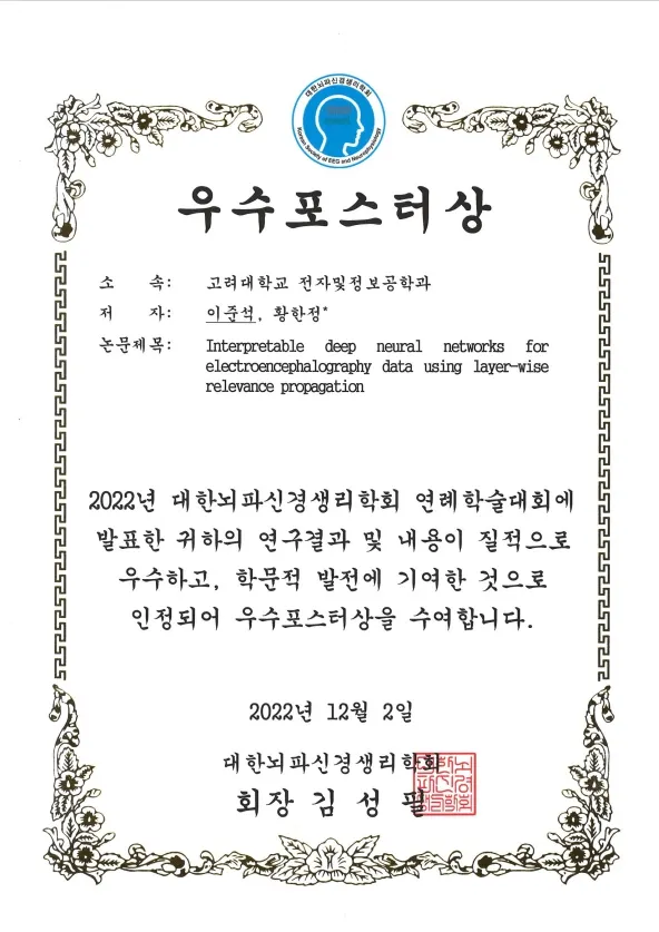 2024 한국뇌공학회 하계워크샵 최우수논문상