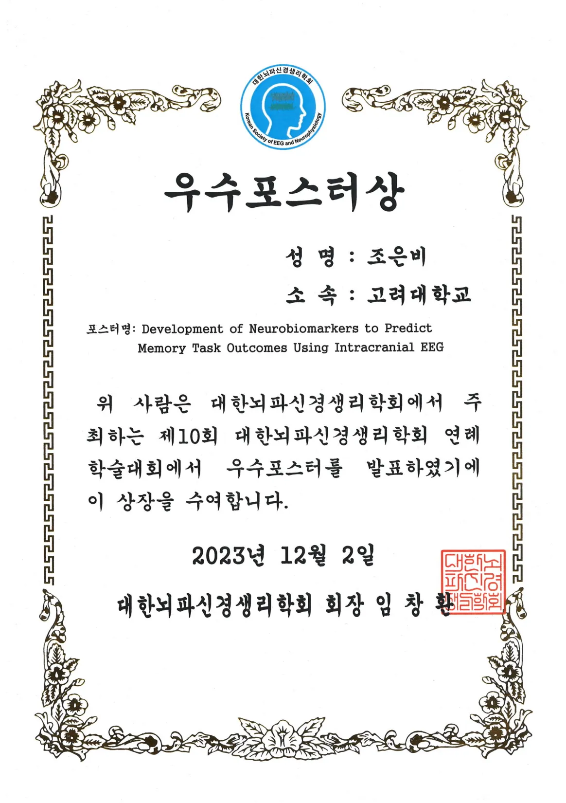 2023 대한뇌파신경생리학회 우수포스터상