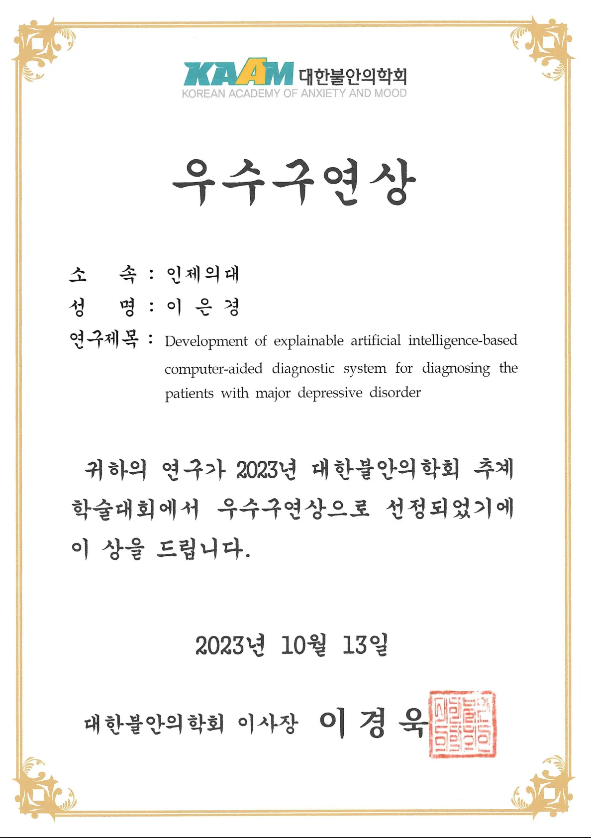 2023 대한불안의학회 추계학술대회 우수구연상