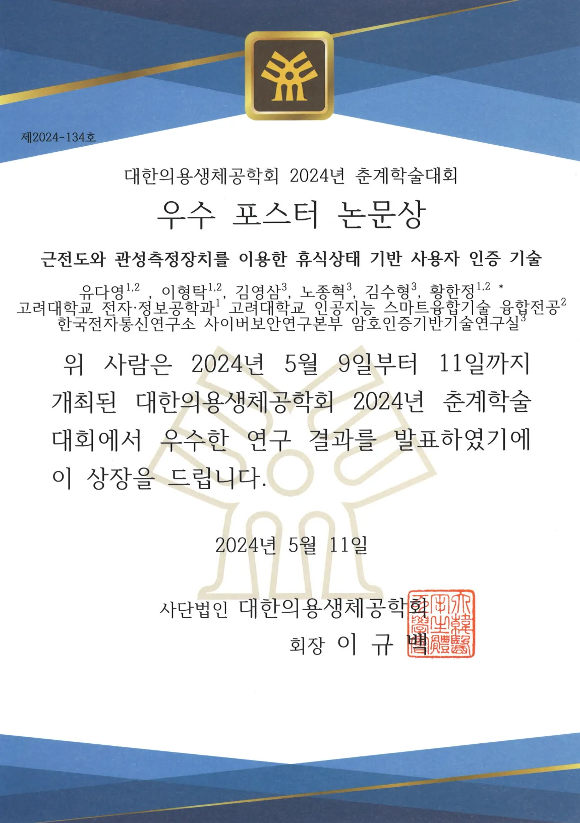 2024 대한의용생체공학회 춘계학술대회 우수포스터상